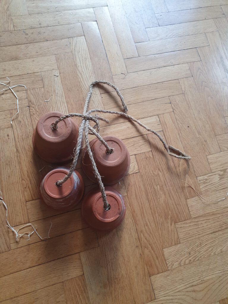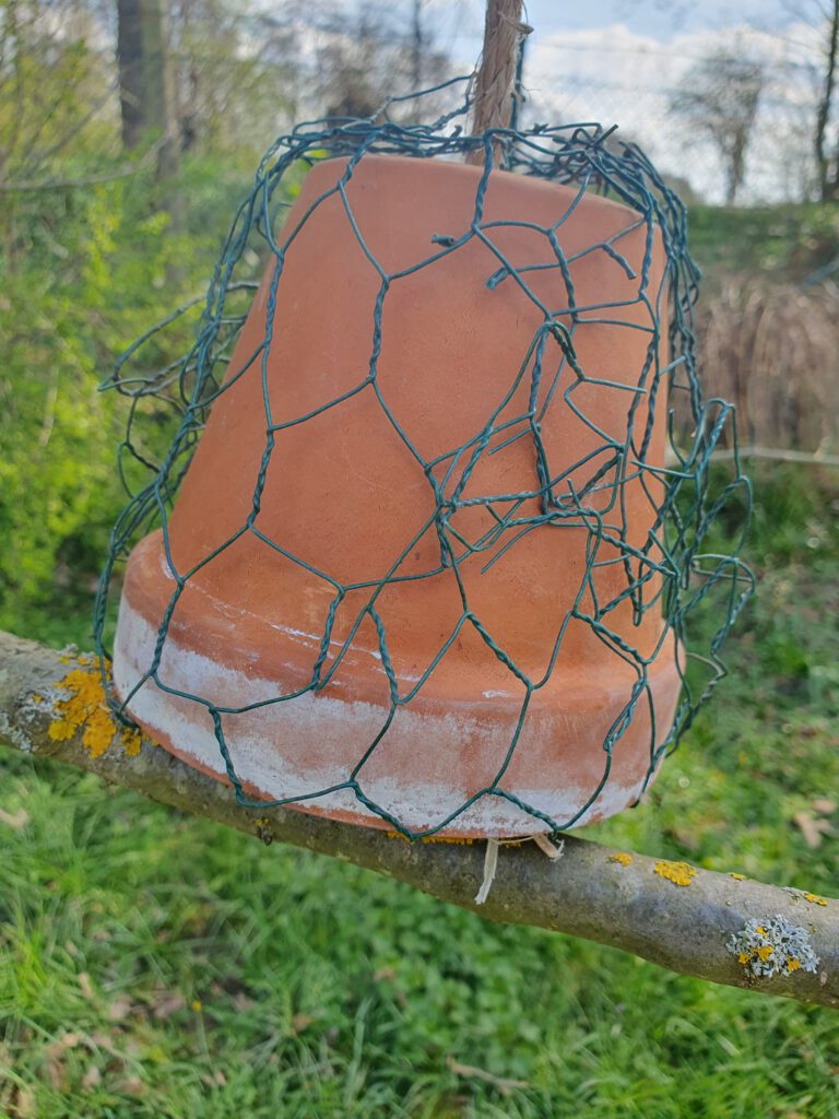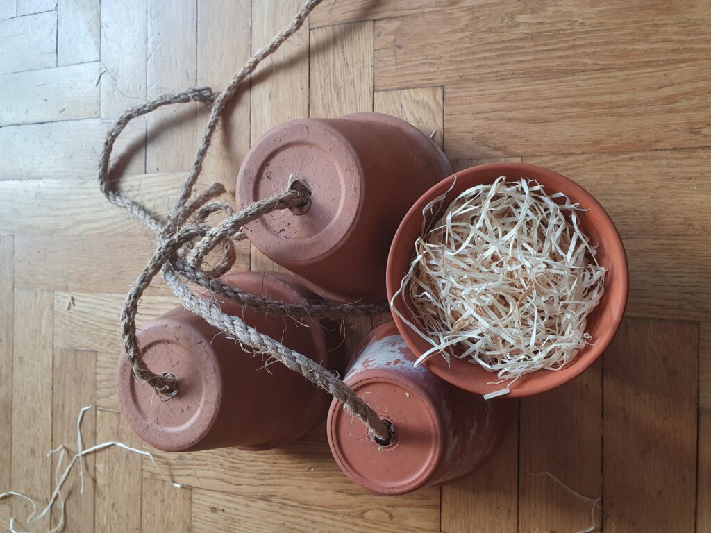 Tontöpfe, bereits mit Holzwolle gefüllt. Darunter ein Stöckchen, um das Aufhängeseil zu fixierenHier sieht man das bereits gefüllte Innere: Darin fühlen sich Ohrwürmer sehr wohl