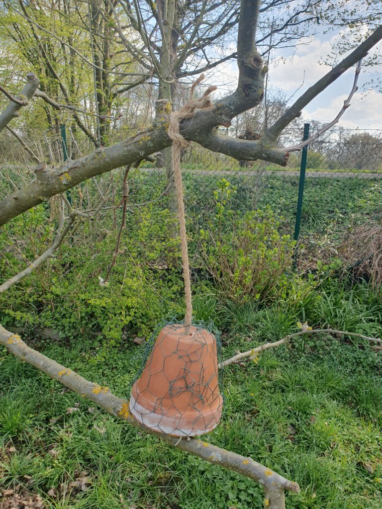 Heute war ich wieder im Garten und hab‘ die Töpfe erst mit Hasendraht umwickelt: